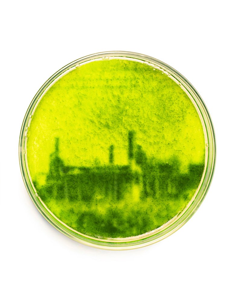 Em 2018, fotografei granjas avícolas e os cursos d’água circundantes de Monett e Sedalia, na zona rural do Missouri. Esses dois locais já foram palco de desastres ambientais e, coletivamente, contribuem para a superabundância de nutrientes, a proliferação de algas e a consequente zona morta que se forma anualmente no Golfo do México. Após a criação das imagens, não consegui identificar um meio adequado que retratasse a interconexão desses ambientes aparentemente díspares. Em 2021, comecei a experimentar o uso de um ampliador de 35 mm e uma unidade de exposição de mesa de luz para cultivar essas fotografias diretamente na microalga Chlorella vulgaris. No negativo fotográfico, as áreas mais escuras recebem mais luz e, portanto, tornam-se mais escuras. O resultado é uma renderização viva que leva uma semana para se formar. Em sua forma final, os resultados são digitalizados e impressos.