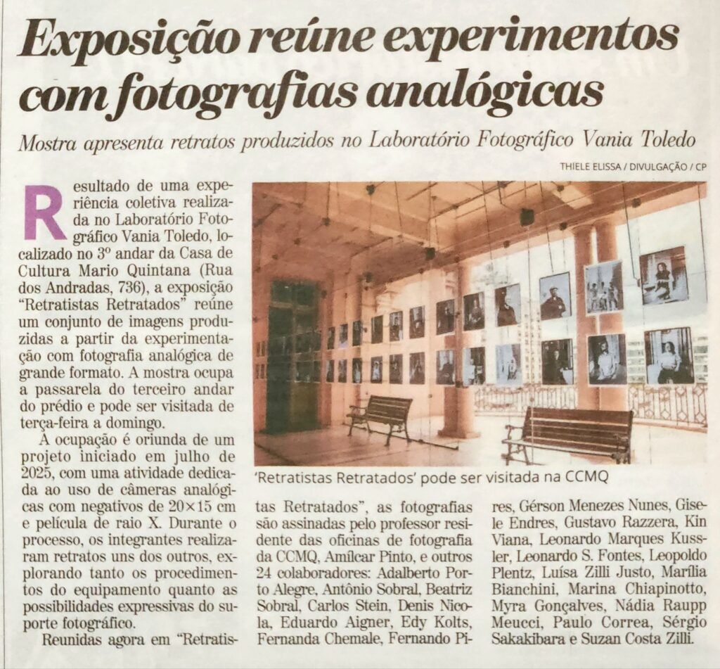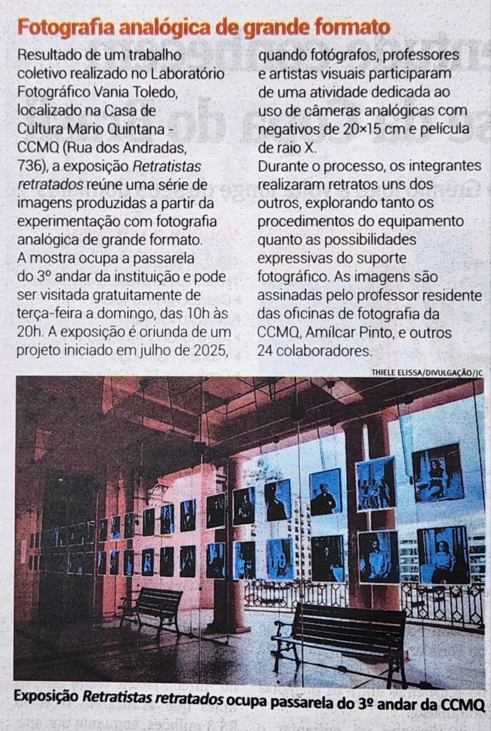 em julho de 2025 fotógrafos, professores e artistas visuais participaram de uma atividade lúdica no Laboratório Fotográfico da Casa de Cultura Mário Quintana, envolvendo fotografia de grande formato com câmeras de filme tamanho 20x15cm, usando película de raio-x, oportunidade em que fizeram retratos uns dos outros para experimentar a técnica e o filme grande. O resultado obtido foi positivado, também em filme de raio-x, proporcionando esta mostra dos resultados obtidos.