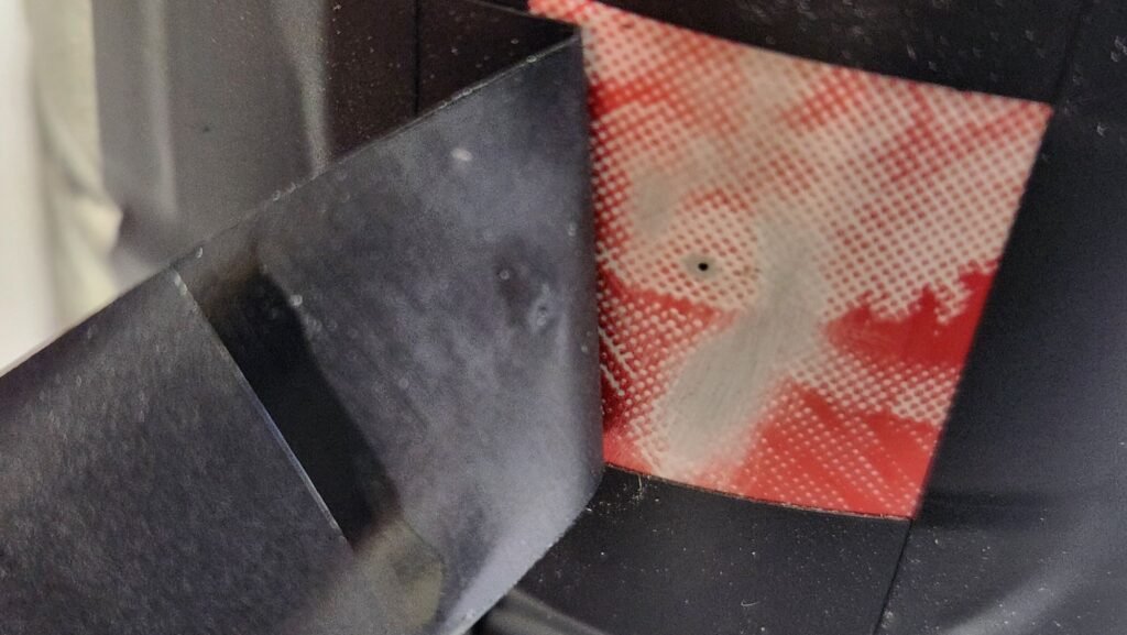Fazemos um furo com um prego gande num ponto médio da lata, sem se preocuipar com o amassado, que deve ser batido para fora com um alicate ou martelo pequeno. Depois este furio deve ser alargado, pode ser com um alicate de bico uma telsoura grande. Deve ser alargado de forma que não vinhete a imagem final, e batido por dentro para rebaixar as rebarbas.