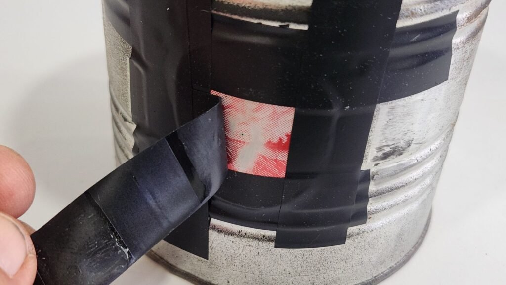 o alujmínio com o furo é preso na lata com fita isolante, que também é usada para fazer o obturador.